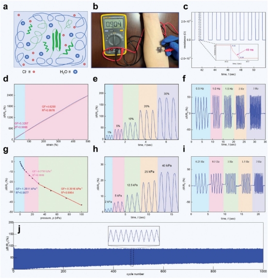 SFH具有穩(wěn)定且高的導電性。室溫電導率為3.6 S cm-1,隨絲素溶液增加而提高,打印的SFH也使皮膚表面更具導電性。SFH 的傳感性能通過各種應變下相對電阻變化的可重復性來證明。SFH 的傳感性能由不同頻率下的連續(xù)應變表示。電信號的頻率為0.5至3 Hz,覆蓋大多數(shù)人群的脈沖頻率。在連續(xù)壓縮下,電信號顯示出良好的再現(xiàn)。表明SFH 可以為應變和壓力模型提供穩(wěn)定的電信號。
