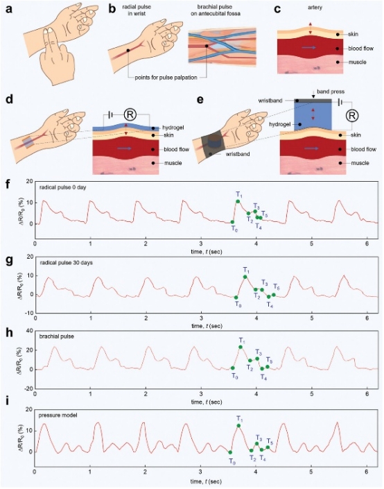 SFH可用于脈搏波形監(jiān)測。SFH被置于腕帶下,應變傳感器記錄由于 SFH 應變引起的電阻信號,即平行于皮膚的變形。設計的應變和壓力傳感器能高精度檢測橈動脈和肱動脈脈搏波形,提供一致、可靠、高精度且功能豐富的波形,如前進波、反射波、重搏波等,以及對應的特征點 ,用于計算多種生理參數(shù),從而能夠對血壓和心血管功能進行后續(xù)分析和預測。