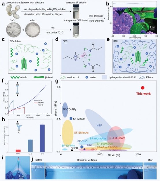 以家蠶繭絲素溶液為原料,與由氯化膽堿(ChCl)和丙烯酰胺(AAm)混合加熱制成的深共熔溶劑(DES),在光引發(fā)劑作用下經紫外光固化,5分鐘內可制得透明的SFH,其形狀由模具和澆筑量控制。SFH 具有良好的透明度和透射率,透射率在400至800 nm的波長范圍內超過95%。
