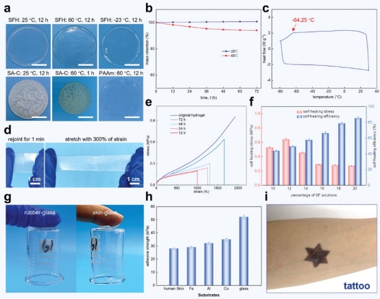 SFH具有優(yōu)異的機械性能,比較了常規(guī)多網(wǎng)絡水凝膠(由 SF 溶液、PAAm和水組成,表示為SA-C)和氫鍵增強的合成聚合物水凝膠(由 PAAm、ChCl和水組成,表示為PAAm水凝膠)。SFH強度達0.96MPa,斷裂應變1962%,能承受4.6kg的重物,韌性為3.74MJm?3,楊氏模量0.42MPa,低于人體皮膚模量,斷裂能為16.5 kJm?2。較高濃度的SF 溶液(14%、16% 和 18%)會導致較低的強度和較高的斷裂應變(>2000%,超出質構儀的應變范圍)。選擇SFH(16% SF 溶液)并用手拉伸,可被拉伸至原始長度的24倍而不破裂,并在釋放后1分鐘內完全恢復。
