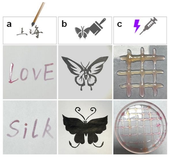 SFH具有優(yōu)異的印刷適性。SFH前驅體由于粘度低,可直接用于打印。前驅體的凝膠轉變可以很快完成,紫外光下用注射器手動測試了擠出打印,表明SFH具有3D打印的潛力。