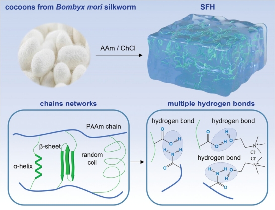 近年來,可穿戴電子設備為健康監(jiān)測帶來了新的曙光。其中,水凝膠傳感器因與生物組織相似,在實際應用中備受關注。然而,普通水凝膠存在不少 “硬傷”,如機械強度差、易脫水和凍結、粘性弱、自我修復能力不足等。為了解決這些問題,研究團隊將目光投向了絲素水凝膠(SFH)。研究人員以家蠶繭中的絲素溶液為基礎,讓它與聚丙烯酰胺(PAAm)通過氯化膽堿(ChCl)形成鏈狀網(wǎng)絡,成功制備出了性能卓越的絲素水凝膠。研究結果以“Silk Fibroin Hydrogel for Pulse Waveform Precise and Continuous Perception”為題發(fā)表在Advanced Healthcare Materials上。