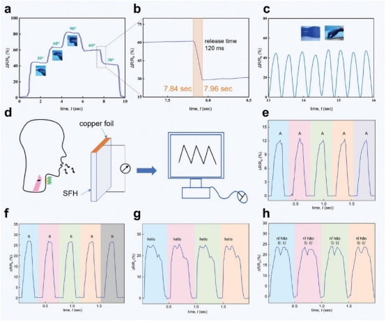 SFH傳感器具有較低的檢測限和較寬的感應范圍,在不同的人為信號中顯示出潛力。貼在手指關節(jié)和手腕,能精準監(jiān)測動作,相對電阻變化重復精度高;作為語音傳感器,能捕捉發(fā)音時獨特的電阻信號模式,可用于語音識別。