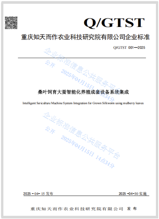 為了提升企業(yè)管理水平、規(guī)范企業(yè)內(nèi)部流程,增強(qiáng)企業(yè)競爭力,2025年4月30日,重慶知天而作農(nóng)業(yè)科技研究院有限公司《桑葉飼育大蠶智能化養(yǎng)殖成套設(shè)備系統(tǒng)集成》企業(yè)標(biāo)準(zhǔn)正式發(fā)布。該標(biāo)準(zhǔn)規(guī)定了桑葉飼育大蠶智能化養(yǎng)殖成套設(shè)備系統(tǒng)集成的術(shù)語和定義、系統(tǒng)集成組成、系統(tǒng)集成功能、系統(tǒng)集成部署、系統(tǒng)集成調(diào)試及驗(yàn)收、系統(tǒng)集成運(yùn)行及維護(hù),適用于重慶知天而作農(nóng)業(yè)科技研究院有限公司桑葉飼育大蠶智能化養(yǎng)殖成套設(shè)備系統(tǒng)集成的設(shè)計(jì)、制造、安裝與調(diào)試、維護(hù)和使用。