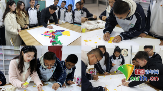 研支團(tuán)成員與金山實驗學(xué)校黨員教師和學(xué)生制作蠶繭拼畫