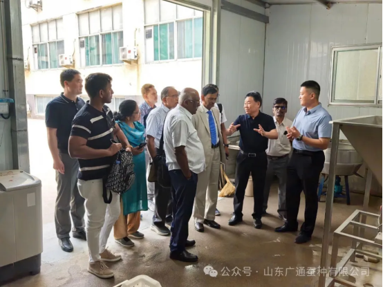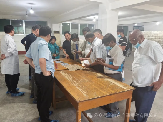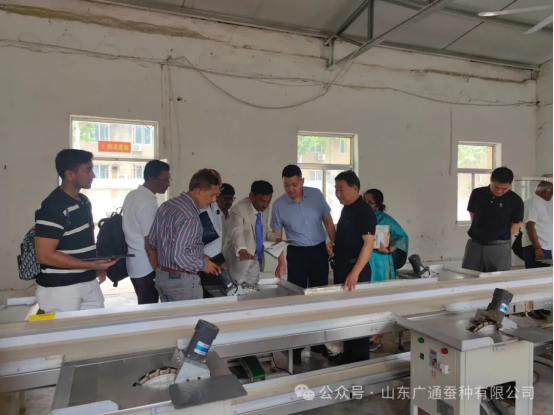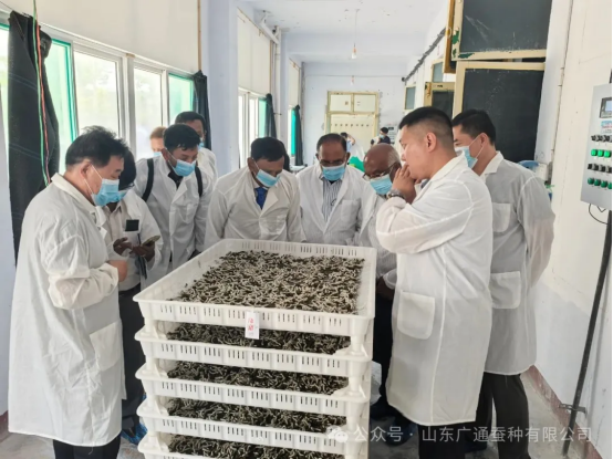5月22日,印度絲綢協(xié)會代表團一行先后到廣通寶葉綠素生產(chǎn)車間、生產(chǎn)本部基地機械化車間、原種生產(chǎn)基地、人工飼料養(yǎng)蠶車間、集團蠶種冷庫、質(zhì)檢中心就蠶沙葉綠素生產(chǎn)、制種生產(chǎn)機械化、原種生產(chǎn)、人工飼料養(yǎng)蠶、蠶種冷藏浸酸、蠶種質(zhì)量檢驗等全流程生產(chǎn)環(huán)節(jié)進行現(xiàn)場參觀。