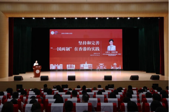 會(huì)見后,林鄭月娥在學(xué)校存菊堂以《堅(jiān)持和完善“一國兩制”在香港的實(shí)踐》為題發(fā)表演講。結(jié)合自身履職經(jīng)歷,她系統(tǒng)回顧了“一國兩制”產(chǎn)生的歷史背景和實(shí)踐歷程,從政治、經(jīng)濟(jì)、社會(huì)等多個(gè)維度論證了“一國兩制”是中國特色社會(huì)主義的偉大創(chuàng)舉,是香港保持長期繁榮穩(wěn)定的最佳制度安排。她表示,有“一國兩制”保駕護(hù)航,香港一定能更好地發(fā)揮“背靠祖國,聯(lián)通世界”的優(yōu)勢(shì),積極融入國家發(fā)展大局。講座中,她還介紹了香港打造國際高端人才集聚高地的發(fā)展規(guī)劃及吸引海內(nèi)外人才的具體舉措,誠摯邀請(qǐng)廣大青年學(xué)子赴港學(xué)習(xí)、就業(yè)和發(fā)展,攜手為強(qiáng)國建設(shè)、民族復(fù)興貢獻(xiàn)智慧與力量。