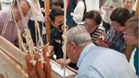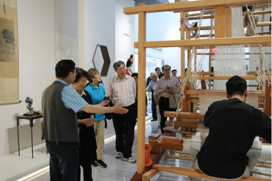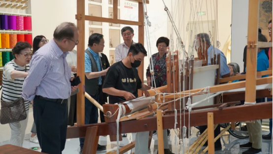 院士專(zhuān)家頗有興趣地觀看了現(xiàn)場(chǎng)用大花樓織機(jī)正在古法復(fù)刻的南宋出土的絲織物——星地折枝山茶梅花紋綾作品并與非遺傳承人萬(wàn)老師做了互動(dòng)。