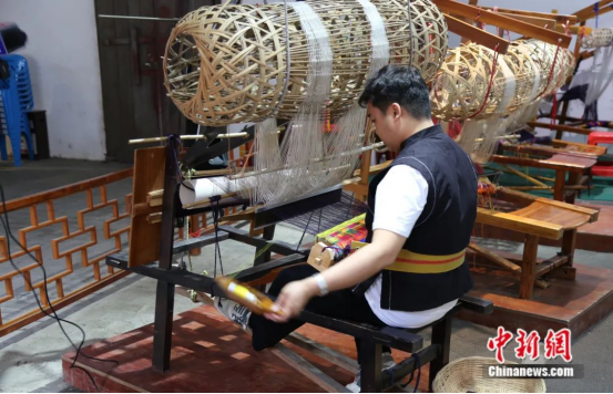 圖為當(dāng)?shù)孛癖娫谑褂脗鹘y(tǒng)織布機織壯錦