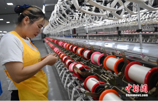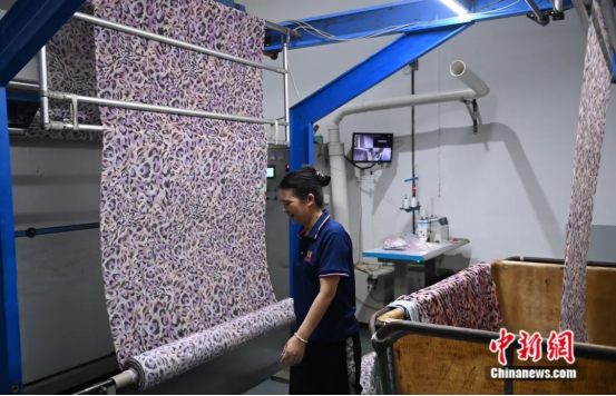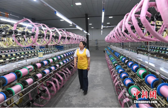 圖為民眾在現(xiàn)代化紡織綢廠工作