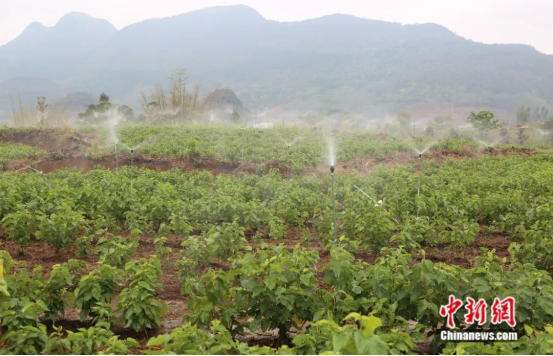 在廣西來賓市忻城縣紅渡鎮(zhèn)600畝現(xiàn)代化桑園示范基地內(nèi),智慧水肥一體化灌溉設(shè)備正在對連片的桑樹進(jìn)行噴灌作業(yè)。