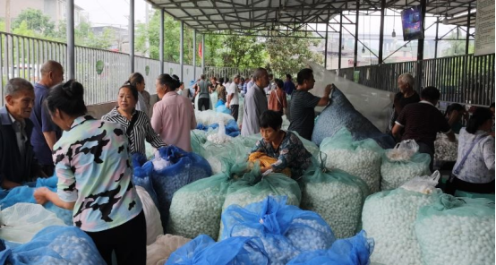 在孝兒鎮(zhèn)蠶繭收購點(diǎn),前來售繭的小貨車、三輪車絡(luò)繹不絕,蠶農(nóng)們有序排隊(duì)等候,現(xiàn)場一片豐收的喜悅景象。一袋袋雪白的蠶繭經(jīng)過篩選、定級、稱重、計價、開票,變成了蠶農(nóng)手中實(shí)實(shí)在在的收入。?據(jù)了解,本季孝兒鎮(zhèn)共發(fā)放蠶種8000張,單產(chǎn)約55公斤左右,產(chǎn)繭約44萬公斤,產(chǎn)值約3000萬元。