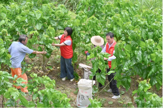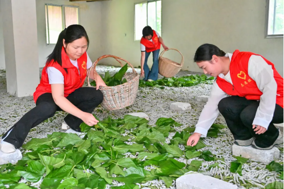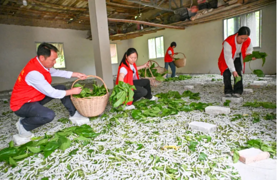 6月5日,岳西縣菖蒲鎮(zhèn)轉橋村黨員志愿者幫蠶農(nóng)摘桑葉