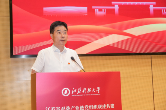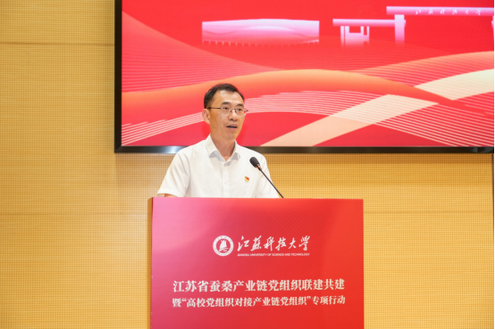 楊建新在致辭中對(duì)與會(huì)領(lǐng)導(dǎo)和師生表示熱烈歡迎。他指出,江科大黨委認(rèn)真落實(shí)省委關(guān)于加強(qiáng)產(chǎn)業(yè)鏈黨建工作的指導(dǎo)意見(jiàn),主動(dòng)融入江蘇省蠶桑產(chǎn)業(yè)高質(zhì)量發(fā)展需求,與省農(nóng)業(yè)農(nóng)村廳種業(yè)處等黨組織共同發(fā)起江蘇省蠶桑產(chǎn)業(yè)鏈黨組織聯(lián)建共建活動(dòng)。他強(qiáng)調(diào),此次共建活動(dòng)既是全省蠶桑產(chǎn)業(yè)界貫徹落實(shí)習(xí)近平總書(shū)記提出的“江蘇要在強(qiáng)鏈補(bǔ)鏈延鏈上展現(xiàn)新作為”“打造具有全球影響力的產(chǎn)業(yè)科技創(chuàng)新中心”等重大要求的有力舉措,更是江蘇科技大學(xué)通過(guò)黨建創(chuàng)新,探索“強(qiáng)國(guó)建設(shè)、高校何為”這一時(shí)代命題的生動(dòng)實(shí)踐。