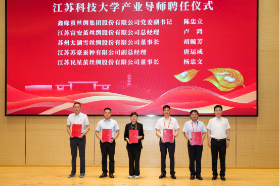 在會(huì)議的第二階段“高校黨組織對(duì)接產(chǎn)業(yè)鏈黨組織”專(zhuān)項(xiàng)行動(dòng)中,鑫緣繭絲綢集團(tuán)股份有限公司黨委副書(shū)記陳忠立、富安繭絲綢股份有限公司總經(jīng)理盧鴻、蘇州太湖雪絲綢股份有限公司董事長(zhǎng)胡毓芳、江蘇蘇豪蠶種有限公司副總經(jīng)理唐運(yùn)成、江蘇民星繭絲綢股份有限公司董事長(zhǎng)楊忠文等受聘為江蘇科技大學(xué)產(chǎn)業(yè)導(dǎo)師。楊建新為“產(chǎn)業(yè)導(dǎo)師”頒發(fā)聘書(shū)。