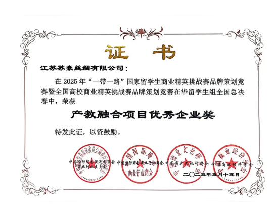 蘇豪股份絲綢公司與南京工業(yè)大學參賽團隊,以繭·裳為項目基調(diào),聯(lián)合打造的產(chǎn)學研項目策劃書榮獲一等獎。同時,憑借在該項目中的卓越貢獻,絲綢公司被授予“產(chǎn)教融合項目優(yōu)秀企業(yè)獎”。