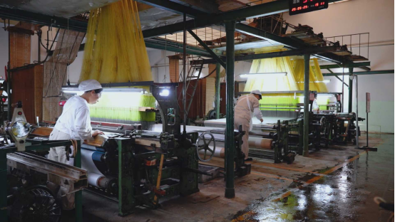 在潞安府潞綢集團(tuán)的織造車(chē)間,機(jī)器轟鳴,銀線穿梭,數(shù)十臺(tái)織機(jī)同時(shí)運(yùn)轉(zhuǎn),工人們正在操作磁控織機(jī)進(jìn)行絲麻面料的織造工作。據(jù)了解,這里總共有70臺(tái)織機(jī),其中傳統(tǒng)提花機(jī)14臺(tái),這些機(jī)器大多數(shù)生產(chǎn)于上個(gè)世紀(jì),其中使用時(shí)間最長(zhǎng)的已經(jīng)近70年,目前主要用于生產(chǎn)軟緞被面、織錦被面、復(fù)古絲巾等產(chǎn)品,雖然機(jī)器設(shè)備年代久遠(yuǎn),但是依然發(fā)揮著不可替代的作用。