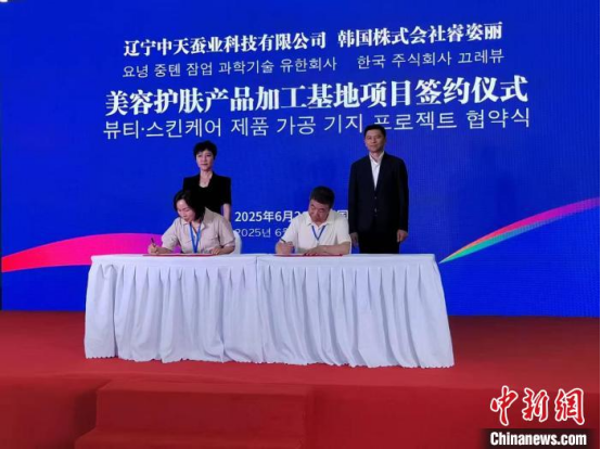 儀式現(xiàn)場,合作雙方簽署在遼寧省內(nèi)合作建設(shè)美容護膚品加工基地項目合作意向書。