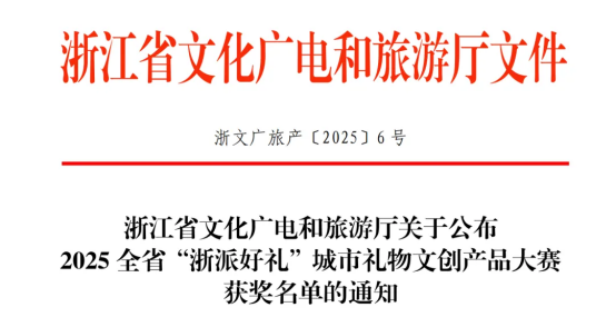 為持續(xù)深化文旅深度融合工程,充分挖掘全省優(yōu)秀文創(chuàng)產(chǎn)品資源,進(jìn)一步釋放文化和旅游消費(fèi)潛力,推動城市文化創(chuàng)新與消費(fèi)升級,切實(shí)提升“浙派好禮”品牌知名度,省文化廣電和旅游廳于近期開展了2025全省“浙派好禮”城市禮物文創(chuàng)產(chǎn)品大賽。經(jīng)前期申報(bào)、評審,共評出2025全省“浙派好禮”城市禮物文創(chuàng)產(chǎn)品大賽金獎產(chǎn)品10件、銀獎產(chǎn)品10件、銅獎產(chǎn)品10件。