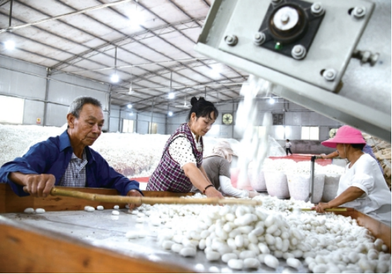 圖為村民在四川儀隴縣土門(mén)鎮(zhèn)初加工廠(chǎng)選繭