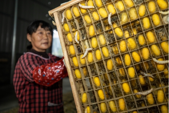 黃金繭色澤金黃,無(wú)需染色,抗氧化與抑菌性能優(yōu)異,適合高端絲綢制品。引入黃金繭后,村民在家門(mén)口實(shí)現(xiàn)了“人人有事做,家家有收入”的致富夢(mèng)?!按謇飵缀跫壹曳N桑養(yǎng)蠶,實(shí)現(xiàn)戶均年增收3萬(wàn)元,村集體年收入也有45萬(wàn)元?!痹S義鳳介紹。