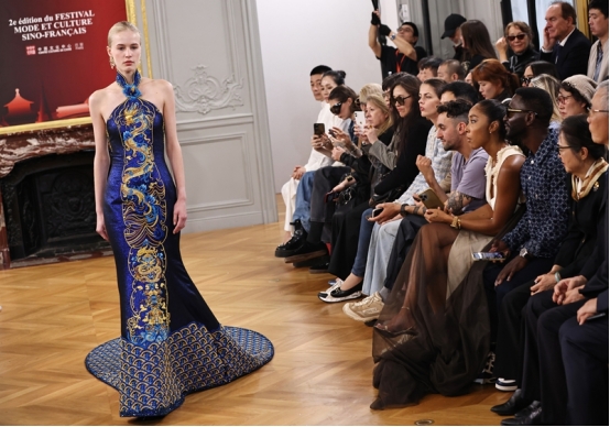 2024年9月27日,在法國(guó)巴黎中國(guó)文化中心,模特在“高情遠(yuǎn)韻”——中國(guó)高級(jí)定制婚嫁禮服品牌六禮的發(fā)布會(huì)上展示服裝