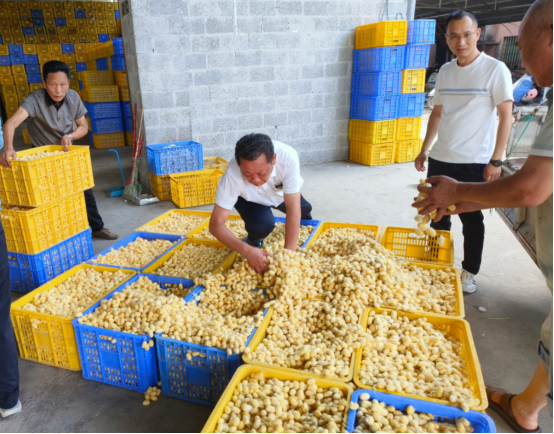吐金黃繭絲,結(jié)天然金黃色繭。近日,在廣西河池市東蘭縣武篆鎮(zhèn)遠航家庭農(nóng)場,由國家科技特派團廣西東蘭團提供蠶種,該農(nóng)場首批試養(yǎng)的“蘇彩2號”黃繭成功上市。