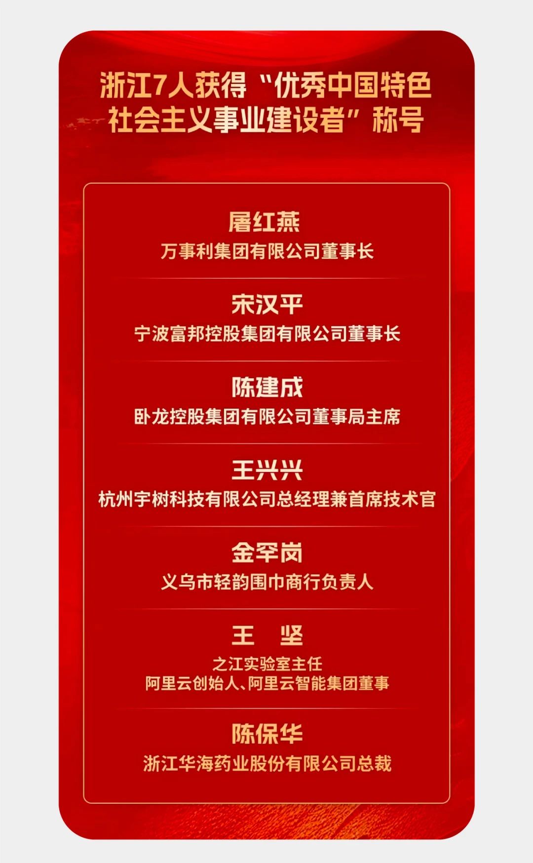 作為浙江民營經(jīng)濟(jì)的優(yōu)秀代表,萬事利集團(tuán)董事長屠紅燕與之江實(shí)驗室主任、阿里云創(chuàng)始人王堅,杭州宇樹科技總經(jīng)理兼首席執(zhí)行官王興興、臥龍控股集團(tuán)董事局主席陳建成等共7人榮獲“優(yōu)秀中國特色社會主義事業(yè)建設(shè)者”稱號。