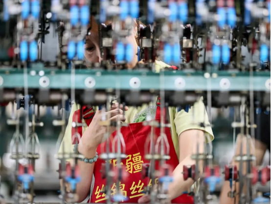 7月29日,在新疆絲錦絲綢紡織有限公司生產(chǎn)車間內(nèi),工人查看絲線。新華社發(fā)(蘭紅光攝)