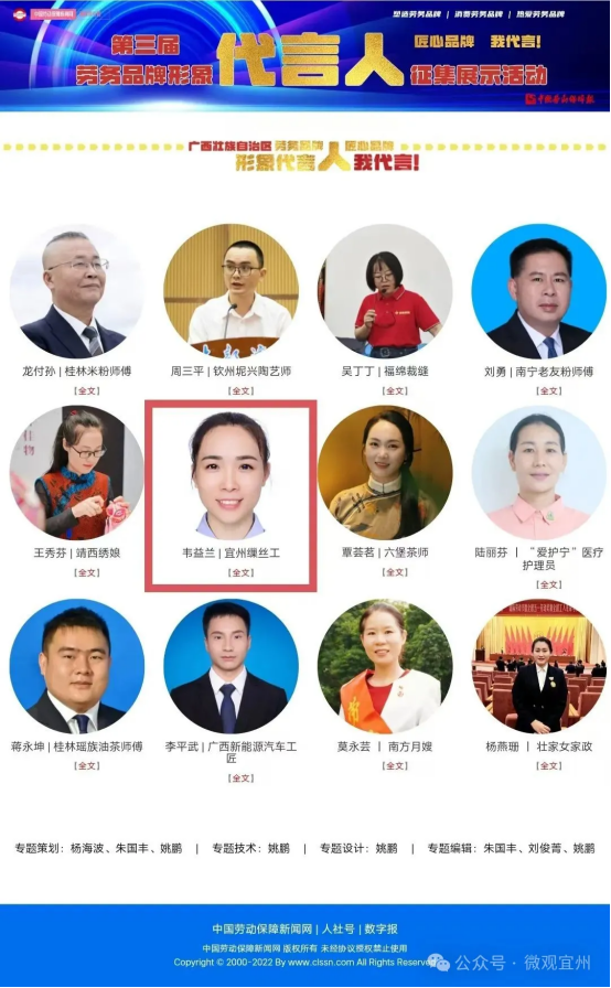 近日,第三屆“勞務(wù)品牌形象代言人”展播活動(dòng)正式啟動(dòng),同步在中國勞動(dòng)保障報(bào)社微信公眾號(hào)和中國勞動(dòng)保障新聞網(wǎng)集中展播38天。廣西河池市“宜州繅絲工”勞務(wù)品牌代言人韋益蘭入選參展。