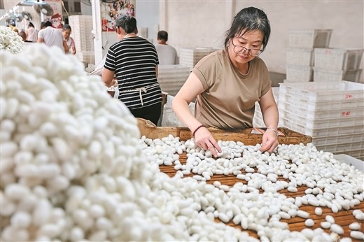 8月12日,在蒙山縣一家蠶絲企業(yè),工人正在忙碌作業(yè),確保按時(shí)完成訂單。近年來,該縣積極構(gòu)建從種桑養(yǎng)蠶到繅絲織綢、服裝加工的完整產(chǎn)業(yè)鏈,目前全縣桑園種植面積達(dá)6.3萬畝,帶動1.2萬農(nóng)戶就業(yè)增收,桑蠶產(chǎn)業(yè)成為縣域經(jīng)濟(jì)發(fā)展的支柱產(chǎn)業(yè)。