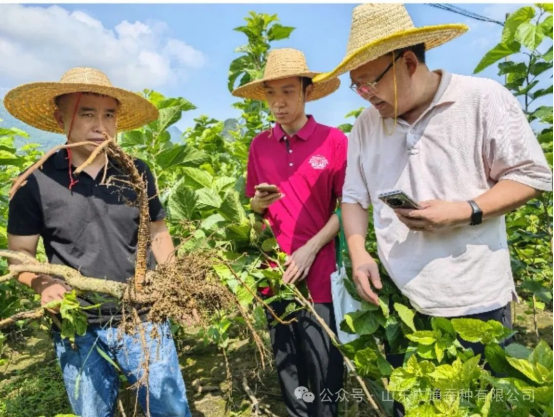 隨后團(tuán)隊(duì)師生在當(dāng)?shù)剞r(nóng)技人員的陪同下,專程到桑樹病害發(fā)生嚴(yán)重的田塊調(diào)研,發(fā)現(xiàn)桑樹長勢不好,桑樹發(fā)生病毒性萎縮病和桑葉褐斑病較普遍,而且死株缺株現(xiàn)象也很嚴(yán)重,專家們拔出桑根發(fā)現(xiàn)既有根結(jié)線蟲危害,也有紫紋羽病的癥狀,劉吉平教授建議,對于缺株死株的地方,用石灰粉消毒,或者用石灰氮穴施/溝施后蓋地膜一段時(shí)間,再補(bǔ)種抗病的桑苗;平時(shí)在桑樹剪伐后,及時(shí)開展桑園清園和用蠶用消毒劑進(jìn)行桑園消毒工作,施肥建議用有機(jī)肥,不要過量使用氮肥,桑園做好排水溝等。通過田間指導(dǎo)、座談交流等形式,向企業(yè)負(fù)責(zé)人、技術(shù)人員傳授了蠶桑病蟲害綠色防控、高效種養(yǎng)等先進(jìn)技術(shù)。環(huán)境環(huán)江蠶業(yè)推廣中心韋善教聽后,連夸道,“國家蠶桑專家的現(xiàn)場指導(dǎo)太給力了,對環(huán)江縣的蠶桑產(chǎn)業(yè)的把脈診斷很及時(shí),提供的技術(shù)方案對蠶農(nóng)的幫助很有用!”。