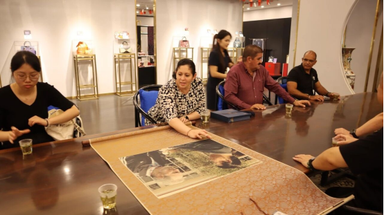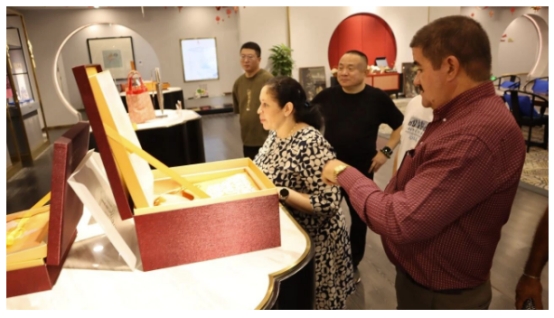 在上久楷宋錦國禮展廳,代表團(tuán)一行觀看了多件曾作為國禮贈送給外國領(lǐng)導(dǎo)人的宋錦國禮。這些作品不僅工藝精湛,更蘊(yùn)含深厚的文化底蘊(yùn)和外交意義。吳建華董事長介紹了上久楷在國禮設(shè)計、制作方面的創(chuàng)新與成就,以及如何通過絲綢這一載體,向世界展示中國文化的魅力。