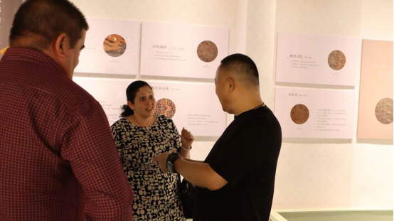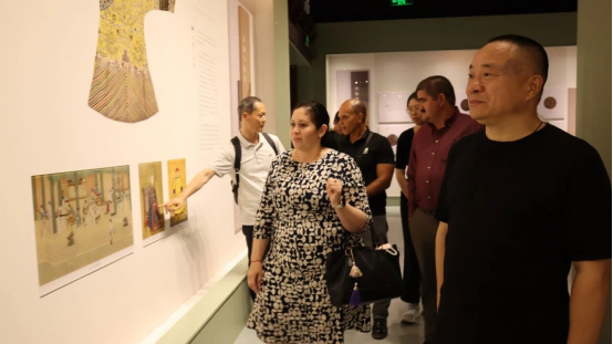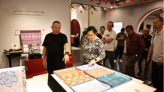 在吳建華董事長的陪同下,古巴代表團(tuán)一行首先參觀了上久楷宋錦文化園。文化園內(nèi)陳列著大量歷史文獻(xiàn)資料、實物及現(xiàn)代創(chuàng)新作品,全面展示了宋錦從古至今的發(fā)展歷程。代表團(tuán)成員對宋錦的千年織造歷史表現(xiàn)出濃厚興趣,不時駐足細(xì)看,詢問宋錦的織造工藝、圖案寓意及文化內(nèi)涵。