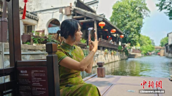 9月,浙江南潯古鎮(zhèn),浙江工業(yè)大學(xué)的留學(xué)生HAN HTAR HTAR(中文名,韓桃桃)坐船欣賞古鎮(zhèn)風(fēng)光