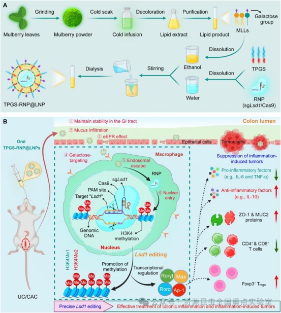 鑒于此,肖波教授團(tuán)隊(duì)開發(fā)了一種經(jīng)實(shí)驗(yàn)室優(yōu)化的口服遞送平臺:將靶向 Lsd1的RNP封裝進(jìn)桑葉來源的脂質(zhì)納米顆粒(MLLs),并加入FDA批準(zhǔn)的穩(wěn)定劑d-α-生育酚聚乙二醇琥珀酸酯(TPGS)(圖1A)。TPGS的引入顯著增強(qiáng)了LNP的脂質(zhì)雙分子層穩(wěn)定性,使其能夠在胃腸環(huán)境中高效遞送RNP,并提高了其穿透結(jié)腸黏液屏障的能力。進(jìn)一步地,TPGS-RNP@LNPs通過上皮細(xì)胞增強(qiáng)通透與滯留效應(yīng)(EPR效應(yīng))在炎癥結(jié)腸組織中富集,并通過半乳糖受體實(shí)現(xiàn)對巨噬細(xì)胞的特異性靶向。同時(shí),納米顆粒與內(nèi)體膜的膜融合機(jī)制結(jié)合Cas9的核定位信號,確保了RNP的高效核遞送。最終,該系統(tǒng)在小鼠中實(shí)現(xiàn)了顯著的基因編輯效果,并有效緩解了UC和CAC(圖1B)。