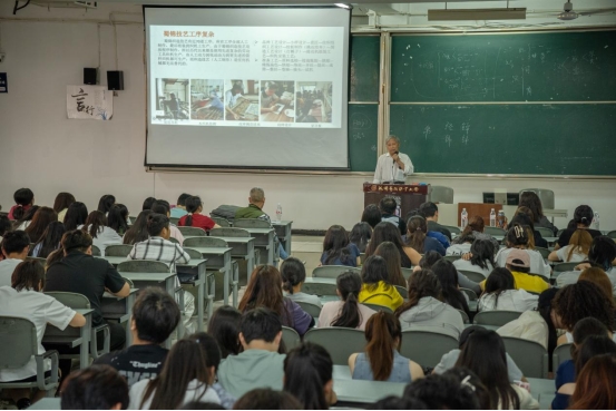 胡光俊先生作為大國工匠典范,投身蜀錦領(lǐng)域50余年,從成都蜀錦廠學(xué)徒成長為國內(nèi)少數(shù)掌握全套蜀錦技藝的大師,其職業(yè)生涯是職業(yè)教育的生動案例。講座中,他回顧了師從蜀錦大師葉乃樹的學(xué)藝經(jīng)歷,系統(tǒng)講解了蜀錦四大工種、70余道工序的工藝精髓,并強(qiáng)調(diào)“傳統(tǒng)技藝是職業(yè)立身之本”。針對學(xué)生關(guān)心的“技藝如何轉(zhuǎn)化為職業(yè)能力”問題,他結(jié)合個(gè)人實(shí)踐指出:1975年首創(chuàng)“雙造”織造法填補(bǔ)國內(nèi)技術(shù)空白;2008年創(chuàng)辦古蜀蜀錦研究所后,研發(fā)“七梭三十六色重緯織造技術(shù)”,推動織機(jī)電子化改造使生產(chǎn)效率提升3倍;近期還帶領(lǐng)團(tuán)隊(duì)完成2023年成都大運(yùn)會獎(jiǎng)牌綬帶設(shè)計(jì)制作,實(shí)現(xiàn)了非遺技藝“從工坊到國際舞臺”的跨越。胡光俊先生還榮獲“一帶一路國際教育聯(lián)盟非遺文創(chuàng)專家”等稱號。