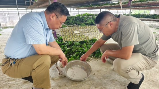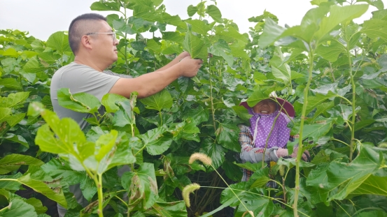 李中華和海安市蠶桑技術(shù)推廣站站長王軍查看秋蠶長勢