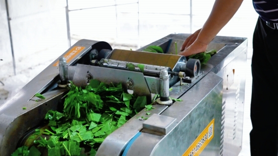 李中華走到切桑機旁,按下啟動鍵,他和工人一起把桑葉倒入進料口,隨著刀片上下擺動,傳送帶上的桑葉細(xì)細(xì)碎碎落進下方的籃筐。李中華說,如果沒有切桑機,用菜刀切桑葉的話,速度很慢。一臺切桑機切八九百斤桑葉,只需要半小時。