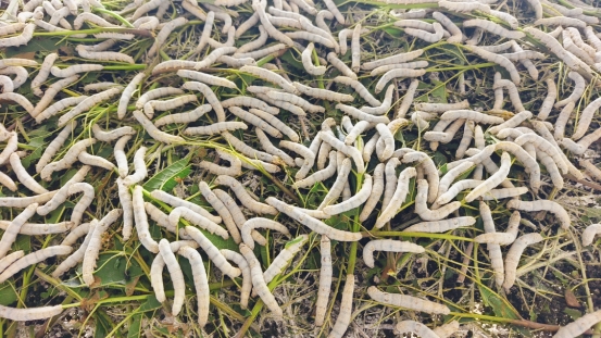 中秋蠶已進入盛食期,還有兩天就要“上山”結(jié)繭。“上山”的“山”,說的是蠶幼蟲經(jīng)過四次蛻皮后,吐絲結(jié)繭所需的特制蠶具“山頭”,比如網(wǎng)格架。不久前的臺風(fēng)帶來的大雨剛剛過去,李中華一看天氣預(yù)報,第二天又有雨,搶收桑葉、備好秋蠶“上山”前的飼料,就在今天。李中華說,盡量不讓蠶吃有水的桑葉,有了優(yōu)質(zhì)的桑葉,才能養(yǎng)出好的蠶。海安栽的桑樹品種是“育71-1”,葉子肥厚,很適宜“菁松皓月”這個品種的蠶?!坝?1-1”養(yǎng)出來的蠶,吐出來的絲能達到6A級。