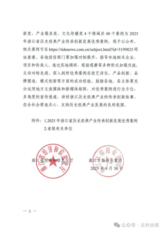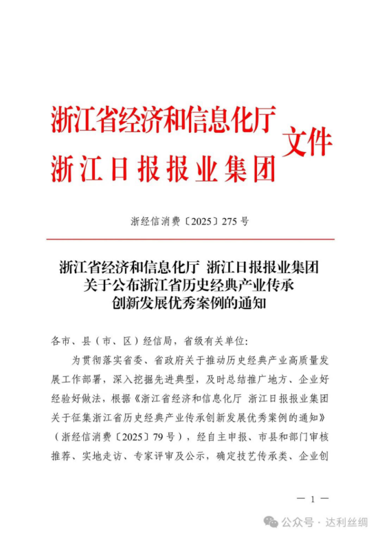 絲企新聞丨達(dá)利絲綢入選2025年浙江省歷史經(jīng)典產(chǎn)業(yè)傳承創(chuàng)新發(fā)展優(yōu)秀案例