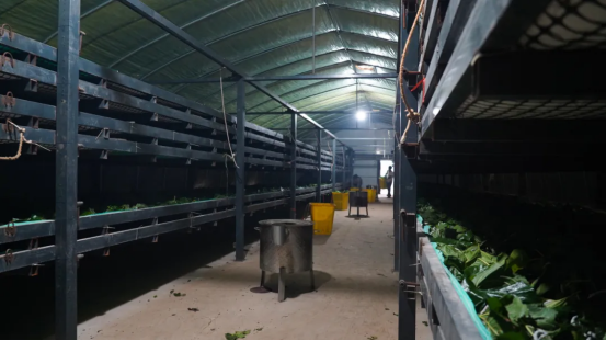 轉(zhuǎn)機發(fā)生在2021年。同村村民李洪康率先嘗試種桑養(yǎng)蠶并獲得成功,這一示范效應(yīng)迅速點燃了周邊群眾的積極性。2024年,王李祥也開始在家中進行小規(guī)模試養(yǎng),并在李洪康的協(xié)助指導(dǎo)下初步掌握了養(yǎng)殖技術(shù)??吹矫骼实那熬昂螅?025年,王李祥果斷投入58萬元,通過整合山地、荒坡等資源,開啟了規(guī)?;B(yǎng)殖之路?!澳壳拔曳N植了30畝桑樹,建成2個產(chǎn)房。如果全部投產(chǎn),可養(yǎng)殖30盒約90萬只蠶?!蓖趵钕榻榻B道。