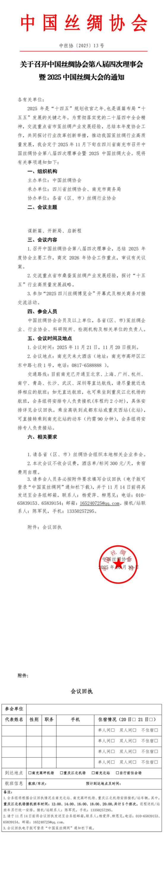 協(xié)會(huì)動(dòng)態(tài)丨中國(guó)絲綢協(xié)會(huì)關(guān)于召開(kāi)第八屆四次理事會(huì)暨2025中國(guó)絲綢大會(huì)的通知
