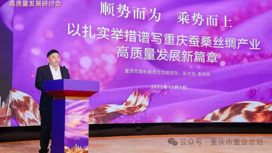 11月7日,重慶市蠶桑絲綢產(chǎn)業(yè)高質(zhì)量發(fā)展研討會(huì)在觀音橋世紀(jì)金源大飯店成功舉辦。來(lái)自全國(guó)蠶桑產(chǎn)業(yè)技術(shù)體系的專(zhuān)家學(xué)者、繭絲綢行業(yè)領(lǐng)軍人才、重點(diǎn)省市的先進(jìn)代表,以及重慶市相關(guān)部門(mén)、區(qū)縣行業(yè)主管單位、科研院所等近百人齊聚一堂,圍繞“推動(dòng)蠶桑絲綢產(chǎn)業(yè)高質(zhì)量發(fā)展”這一主題,共話(huà)產(chǎn)業(yè)價(jià)值、創(chuàng)新路徑與未來(lái)機(jī)遇,攜手繪制蠶桑絲綢產(chǎn)業(yè)“十五五”高質(zhì)量發(fā)展的嶄新篇章。本次研討會(huì)由重慶市商務(wù)委員會(huì)主辦,重慶市商務(wù)委員會(huì)市場(chǎng)體系建設(shè)處處長(zhǎng)張衛(wèi)華主持。