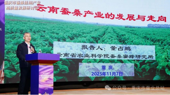 經(jīng)驗(yàn)交流環(huán)節(jié),來(lái)自全國(guó)及市內(nèi)的代表分享了各自在基地建設(shè)、模式創(chuàng)新、延鏈補(bǔ)鏈等方面的創(chuàng)新實(shí)踐與寶貴經(jīng)驗(yàn),為重慶蠶桑絲綢產(chǎn)業(yè)發(fā)展提供了有益借鑒。云南省農(nóng)業(yè)科學(xué)院蠶桑蜜蜂研究所名譽(yù)所長(zhǎng)董占鵬研究員分享了云南桑蠶產(chǎn)業(yè)的發(fā)展與走向。云南依托獨(dú)特的自然稟賦,結(jié)合政策支持、技術(shù)支撐等,成功將生態(tài)優(yōu)勢(shì)轉(zhuǎn)化為產(chǎn)業(yè)優(yōu)勢(shì)和品牌價(jià)值,證明了差異化、高品質(zhì)的發(fā)展路徑同樣具有強(qiáng)大的市場(chǎng)競(jìng)爭(zhēng)力。