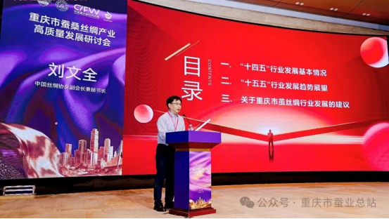 主旨報(bào)告環(huán)節(jié),來(lái)自國(guó)家蠶桑產(chǎn)業(yè)技術(shù)體系的三位權(quán)威專(zhuān)家圍繞產(chǎn)業(yè)創(chuàng)新展開(kāi)精彩分享,為重慶乃至西部蠶桑絲綢產(chǎn)業(yè)發(fā)展提供了新思路、新方向。中國(guó)絲綢協(xié)會(huì)副會(huì)長(zhǎng)兼秘書(shū)長(zhǎng)劉文全在《“十五五”中國(guó)繭絲綢行業(yè)發(fā)展趨勢(shì)展望》講話(huà)中對(duì)“十五五”時(shí)期的行業(yè)發(fā)展趨勢(shì)作出展望。他指出,未來(lái)行業(yè)將呈現(xiàn)四大趨勢(shì):蠶桑生產(chǎn)格局重塑、絲綢工業(yè)加速革新、絲綢消費(fèi)前景持續(xù)向好、國(guó)際絲綢市場(chǎng)競(jìng)爭(zhēng)更趨激烈。劉文全強(qiáng)調(diào),在新的起點(diǎn),希望業(yè)界守正創(chuàng)新,共同開(kāi)創(chuàng)中國(guó)繭絲綢產(chǎn)業(yè)的美好未來(lái)。