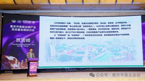 廣西壯族自治區(qū)蠶業(yè)技術(shù)推廣總站技術(shù)推廣科科長(zhǎng)賈雪峰高級(jí)農(nóng)經(jīng)師分享了廣西通過(guò)種桑養(yǎng)蠶、良種筑基、科技賦能等手段實(shí)現(xiàn)富農(nóng)興業(yè),繭絲綢加工產(chǎn)業(yè)鏈不斷延伸拓展,形成從“東桑西移”到“東綢西移”,全產(chǎn)業(yè)鏈集群發(fā)展,為大家提供了如何通過(guò)系統(tǒng)化、組織化方式將產(chǎn)業(yè)做大做強(qiáng)的寶貴思路。