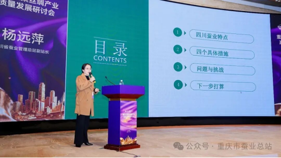 四川省蠶業(yè)管理總站副站長(zhǎng)楊遠(yuǎn)萍系統(tǒng)闡述了四川省蠶桑產(chǎn)業(yè)的發(fā)展特點(diǎn)及四項(xiàng)重點(diǎn)舉措。她表示四川省下一步將著力做優(yōu)生產(chǎn)供應(yīng)鏈以夯實(shí)原料基礎(chǔ),并通過(guò)做強(qiáng)精深加工、做響品牌價(jià)值、做實(shí)服務(wù)支撐等關(guān)鍵舉措,全面提升四川蠶桑產(chǎn)業(yè)的發(fā)展能級(jí)與市場(chǎng)競(jìng)爭(zhēng)力。