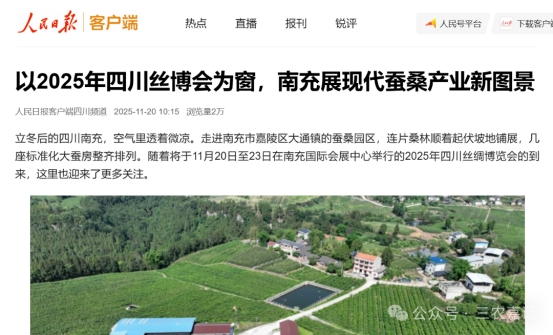 11月20日,《人民日報(bào)》刊發(fā)《以2025年四川絲博會為窗,南充展現(xiàn)代蠶桑產(chǎn)業(yè)新圖景》,多次提到嘉陵蠶桑產(chǎn)業(yè)發(fā)展場景,全文如下: