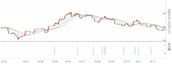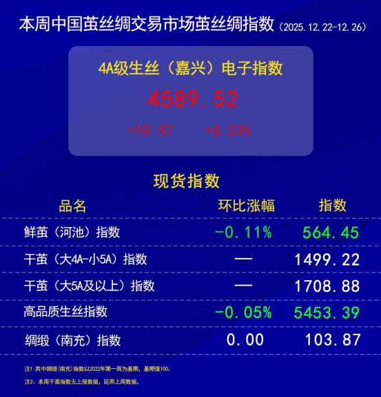 今日(2025年12月26日,周五)中國(guó)繭絲綢交易市場(chǎng)生絲電子指數(shù)微漲0.06%報(bào)收于4589.52點(diǎn),本周生絲指數(shù)累計(jì)上漲0.23%。B絲2022D(商檢4A級(jí)生絲):260125合約報(bào)平,收于45.81萬元;260325合約上漲0.06萬元報(bào)收于46.14萬元;260925合約報(bào)平,收于45.90萬元。